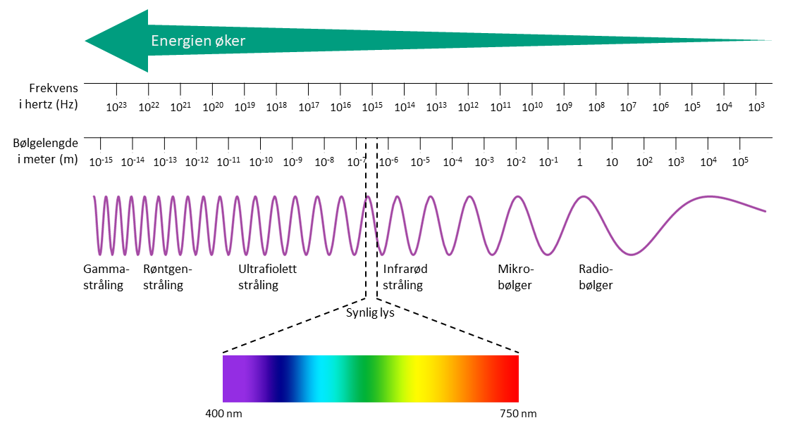 Elektromagnetisk spekter med bølgelengder og frekvensområder. Kilde: EduData (2026).
